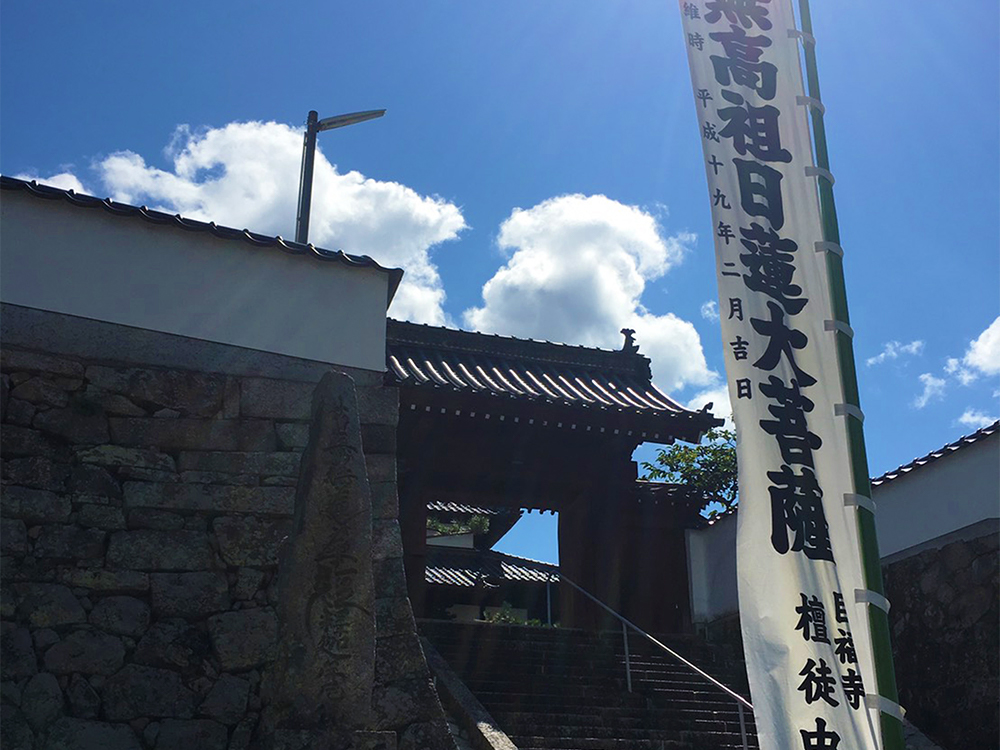当山は、日蓮門徒帝都弘通・京都開教の祖であり、日蓮聖人の孫弟子・日像上人の直弟子である大覚大僧正妙実上人(1297~1364、一説には皇室の生まれともいわれる)が、野山(現・吉備中央町)妙本寺を拠点に備前・備中・備後を布教されていた頃、当所松山(現・備中高梁)米山難波4代目新左衛門夫妻が、大覚大僧正の法門・教えに深く感銘され、法華経に帰依し、延文3年(1358)、この地に大覚大僧正を開山と仰ぎ草庵を設け、当地松山唯一の法華道場となったのが始まりです。