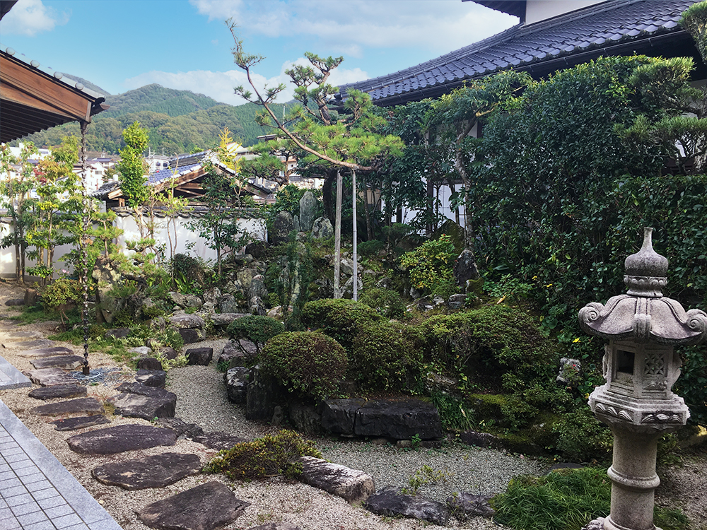 当山の庫裡客殿は、平成13年、第38世本然院日脩上人代に改築され、その前には江戸初期に造られた枯山水小庭園(作者不明)があり、三尊石組による枯滝、護岸の石列美、宝来石の庭園心臓部など観賞的に造られていて、地方稀にみる隠れ小庭園です。